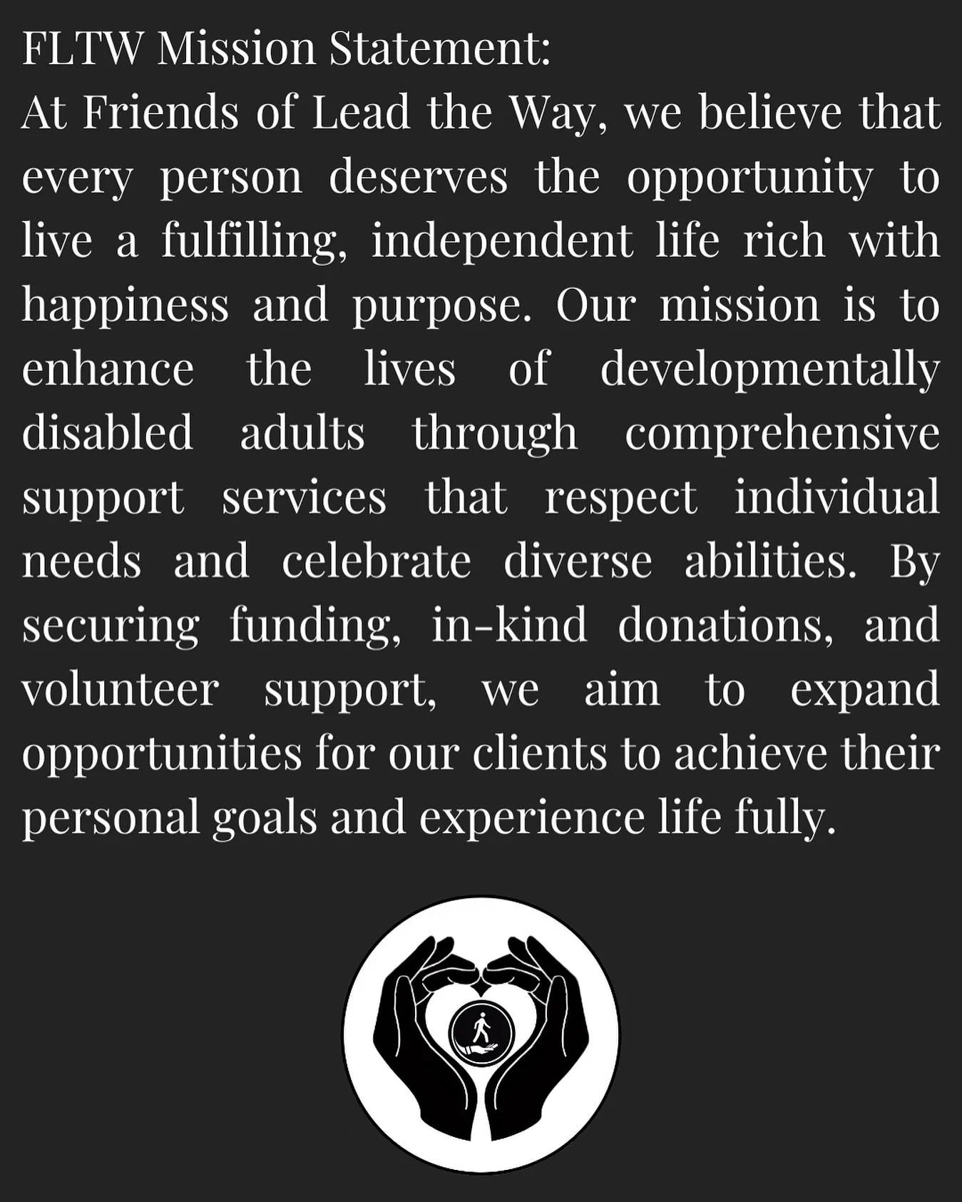 At Friends of Lead The Way, we believe that every person deserves the opportunity to live a fulfilling, independent life rich with happiness and purpose. Our mission is to enhance the lives of developmentally disabled adults through comprehensive support services that respect individual needs and celebrate diverse abilities. By securing funding, in-kind donations, and volunteer support, we aim to expand opportunities for our clients to achieve their personal goals and experience life fully.